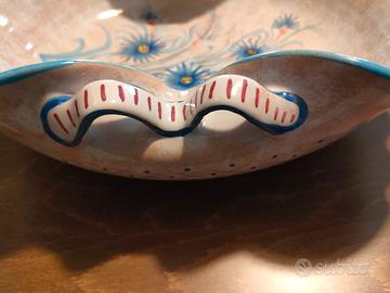 Centrotavola o porta frutta dipinto a mano in ceramica Deruta. Su sfondo nocciola chiaro sono dipinti dei fiori azzurri. Misura 34 x 28 x 10 h. Presenta una piccola sbeccatura nella parte del bordo sotto, non visibile nella parte superiore (vedi le foto allegate).