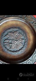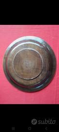 Piatto centrotavola in legno intarsiato, misure diametro 32. Presenta alcuni leggeri graffi da utilizzo.