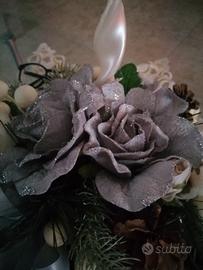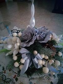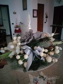 Centrotavola natalizio elegante dai toni del bianco e grigio. Con una candela che si può anche togliere perché non è fissa.