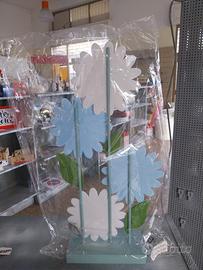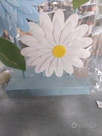 centrotavola con fiori in feltro bianchi e celesti. base di appoggio in legno. altezza circa 50 cm.