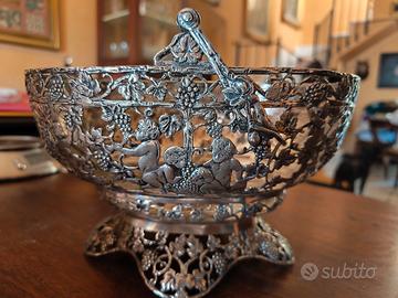 Splendido centrotavola in argento 800, finemente lavorato a traforo con decorazioni a tralci di vite, grappoli d’uva e putti in rilievo.
