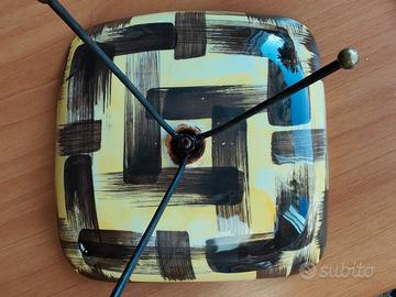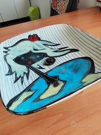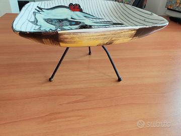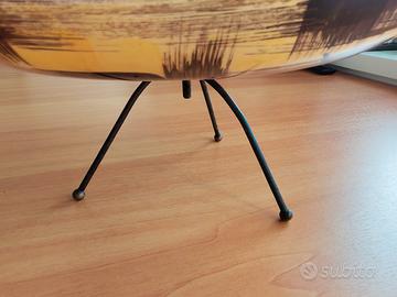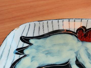 Vendo questo bel piatto ovale in ceramica, realizzato e dipinto interamente a mano in Italia tra gli anni 60/70. Sul davanti è raffigurata una figura femminile stilizzata con viso scuro, occhi azzurri intensi, capelli mossi chiari e un fiore rosso tra i capelli. Lo sfondo è a righe verticali nere su bianco, con corpo in blu e giallo. Sul retro ha un decoro astratto a grandi pennellate marroni su fondo giallo. Il piatto è completo del suo treppiede in metallo nero con pomelli dorati, che lo rende perfetto come centrotavola o per servire frutta, pane o biscotti. Dimensioni: circa 35 cm di lunghezza (misura approssimativa dal bordo) Condizioni: usato ma buono stato generale. Piccola bruciatura/scrostatura sul bordo anteriore (visibile nelle foto), normale per un pezzo artigianale utilizzato. Nessuna crepa o rottura. È un oggetto unico, colorato e dal sapore naïf, perfetto per chi ama l’artigianato italiano e la tavola decorata.