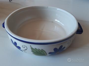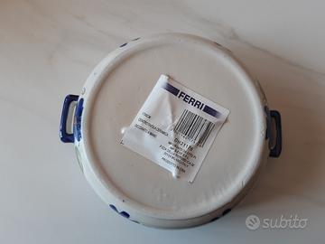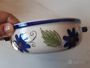 Graziosissimo centrotavola a forma di pentolino in ceramica marca Ferri, bianco con decorazioni floreali blu e manici blu, da usare anche come svuotatasche o portapiantine.