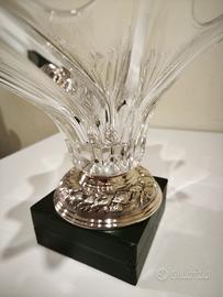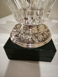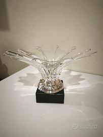 Bellissimo centrotavola in cristallo apertura a smerlo e base in argento lavorato a mano con fiori e foglie finemente incise a sbalzo. L'articolo presenta la punzonatura e la sigla dell'azienda orafa. Mai esposto, risale agli anni '80. Praticamente nuovo.