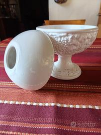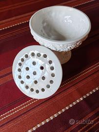 Centrotavola in porcellana bianca, il pezzo superficiale è traforato per l'inserimento dei gambi dei fiori, la coppa è decorata con figure di fiori e frutta.