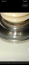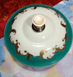porta bon bon in porcellana decorata con oro zecchino, il pomello del coperchi ha la base in argento 800 diametro 18 cm.