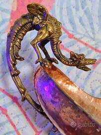 bellissimo ,antico ,in rame e decorazioni in ottone,i grifoni sono bellissimi come in foto; centrotavola,o porta frutta ,zapponato/lucidato,non annerisce ,basta non bagnarlo...solo spolverarlo e rimane perfetto così...per intenditori
