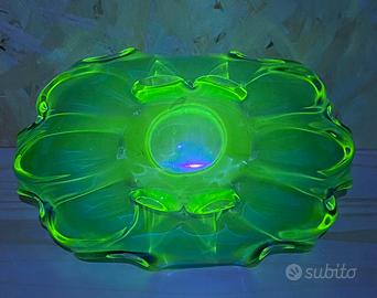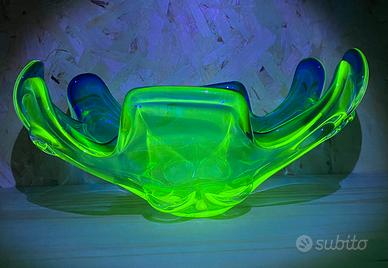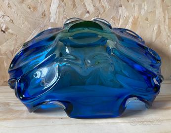 Centrotavola in vetro di grandi dimensioni (altezza 13 cm lunghezza 28 cm larghezza 18 cm) in stile Murano color blu cobalto e verde con ossido di uranio