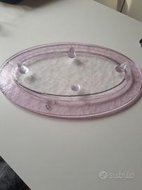 Di Leucos, centrotavola in vetro di Murano, lavorato a mano, superfici materiche, bordura rosata, con piedini, lunghezza cm 41, larghezza cm 26. Nuovo, nella sua confezione originale