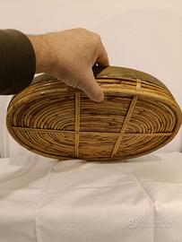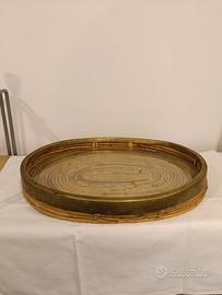 Elegante centrotavola degli anni 70 in midollino e bordo in metallo ottonato, all'interno è presente un cristallo che conferisce ulteriore bellezza all'oggetto. Misura cm 38 x 31 x 6 di altezza