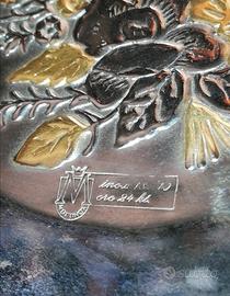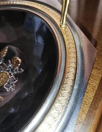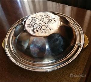 Centrotavola moderno in acciaio con finitura in oro zecchino, elegante e raffinato. Ideale come centro tavola decorativo per tavolo da pranzo, soggiorno o sala da pranzo - oggetto in ottime condizioni perfetto per arredamento moderno e ambienti di design - oro 24kt e acciaio inox con disegno a rilievo - misure da manico a manico cm 21 (foto)