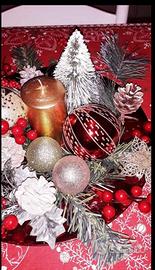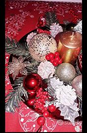 Centrotavola di natale fatto a mano, con piatto rosso circonferenza 34 cm candela dorata, vischio, alberello, palline, pigne e atre decorazioni.