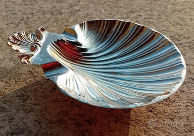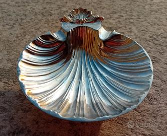 Vendo piattino a forma di conchiglia, con funzione di centrotavola o svuotatasche, placcato argento. Presenta un design dettagliato che imita le scanalature e la forma di una conchiglia naturale, con un piccolo decoro a ventaglio sul bordo superiore, con 3 piedini d'appoggio. La finitura bicolore, che mostra un altro metallo di base sotto l'argento usurato è una caratteristica distintiva dell'Old Sheffield Plate.