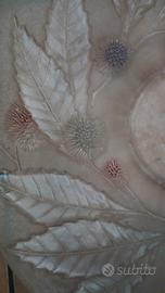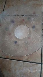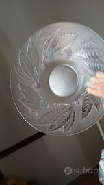 Piatto in vetro trasparente con fiori colorati e foglie in rilievo. Diametro cm 34, profondità cm 13. Peso kg 1,600