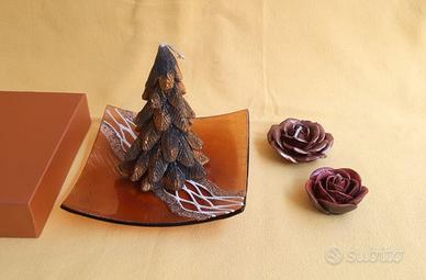 #Centrotavola , Piatto vetro quadrato ambrato /bronzo con candele profumate (rose e albero pino verde)