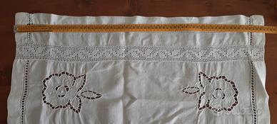 Vendo prezioso centrotavola in lino ricamato, intarsiato e rifinito a mano. Misure riportate in foto. Può essere disposto anche come tenda per una piccola finestra.