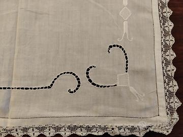 Centrotavola vintage ricamato, con segni del tempo . Il disegno non è simmetrico, probabile riparazione fatta in passato. Misure cm. 57 x 45