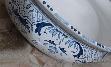 centrotavola/sottovaso in ceramica finemente decorato con motivi floreali blu su sfondo bianco. H circa 15 cm. ,diametro circa 40 cm.Ottime condizioni.