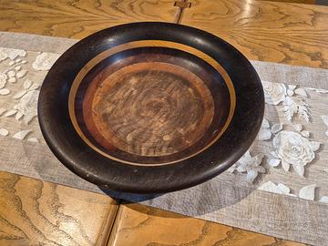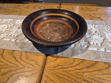Elegante portafrutta o centrotavola realizzato in legno con finiture di pregio. - Design a più strati con contrasto di colori. - Superficie interna con venature naturali del legno. - Bordo esterno scuro e liscio.