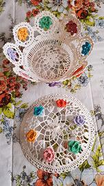 Centrotavola lavorato ad uncinetto con coperchio il tutto inamidato. Solo consegna a mano con formula visto e piaciuto.