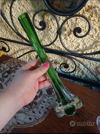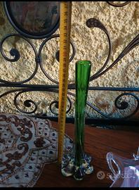 Vendo un bellissimo set composto da centrotavola con base ricamata color argento e parte superiore in vetro rosa sfumato (Murano), più vaso verde lungo.