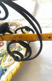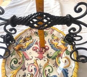 Elegante e particolare centrotavola/fruttiera vintage realizzato interamente a mano in Italia. L'oggetto unisce la tradizione della ceramica artistica alla robustezza del ferro battuto. Caratteristiche principali: Materiale: Piatto in maiolica con decorazione policroma classica (stile Deruta/Raffaellesco) raffigurante draghi e motivi floreali. Supporto: Struttura con manico in ferro battuto lavorato a mano con volute e roselline decorative laterali. Marchi: Sul retro il piatto è numerato (625-1) e presenta il marchio "Made in Italy" a garanzia dell'artigianato autentico. Dimensioni e Peso: Diametro piatto: 22 cm Lunghezza totale: 29 cm Altezza (al manico): 15 cm Peso: 835 gr Condizioni: L'oggetto è in ottime condizioni vintage. Presenta due piccolissime mancanze di smalto sul bordo (visibili nelle foto di dettaglio), del tutto normali per l'età e per la natura artigianale della maiolica, che non ne compromettono l'estetica. Perfetto per arredare una cucina rustica, un salotto classico o come pezzo da collezione per amanti delle ceramiche italiane.