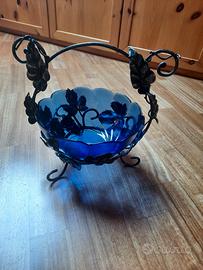 Centrotavola vintage in vetro blu cobalto. il cesto portafrutta è in ferro battuto e la ciotola interna si può togliere. Altezza totale cesto 30 cm , diametro ciotola 23 cm . Il portacandela a forma di tulipano è alto 10 cm e ha un diametro di 10 cm , motivo x cui viene usato anche come vaso o come portacaramelle .