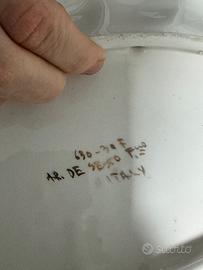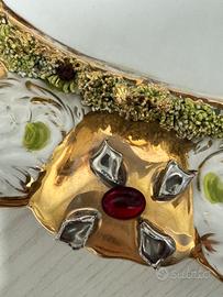 Elegante centrotavola/vassoio decorativo in porcellana lavorata, caratterizzato da finiture dorate e dettagli in rilievo con inserti colorati effetto gioiello. Produzione italiana con dicitura a mano “Art Déco – Sesto Fiorentino” e codice identificativo sul fondo, indicativo di lavorazione artigianale o piccola serie. 📏 Dimensioni: circa 35 cm di lunghezza 🎨 Colori: oro, bianco satinato, dettagli rossi e verdi 🇮🇹 Made in Italy ✔️ Condizioni: molto buone, nessuna rottura o crepa. Normali segni del tempo compatibili con oggetto vintage. Perfetto come: •centrotavola decorativo •elemento d’arredo vintage/retro •idea regalo originale vintage, art deco, centrotavola, vetro decorato, dorato, arredamento, design italiano, Sesto Fiorentino