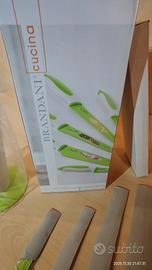 Ceppo coltelli bianco e verde moderno marchio Italiano toscano Brandani. Colore verde brillante e bianco. Include 5 diversi coltelli in acciaio inox e plastica. 5 coltelli con manici bianchi e verdi completi di ceppo porta coltelli abbinato per riporli in modo sicuro ed organizzato. Nuovi. Mai usati. Con scatola originale. Ottimi anche come idea regalo oltre ad un utilizzo pratico e quotidiano