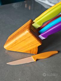 Ceppo con coltelli multicolor con lama seghettata da carne. Ceppo in legno chiaro. Coltelli mai usati, ceppo in buone condizioni.