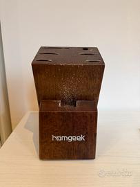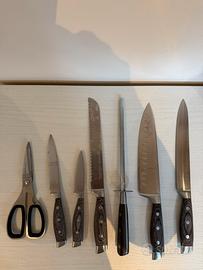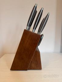 Vendo ceppo in lego + set coltelli in acciaio con forbici da cucina e acciaino per limare le lame dei coltelli.