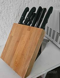 Ceppo porta Coltelli, in legno pieno , a 6 dotazioni , completo di supporto inox a barra da cucina.