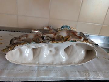 Vendo scultura decorativa in ceramica smaltata raffigurante una cavalla con puledro, con vaso ornamentale integrato sul retro. Produzione italiana vintage, anni ’60.