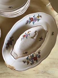 Composto da 10 piatti fondi, 9 piani, 8 piatti dolce dessert, 1 zuppiera, 1 insalatiera, 2 vassoi grandi (uno con difetto), piccola salsiera manico rotto, e 1 piattino da caffè.