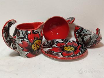 Ceramica Vittoria Mazzotti - Albisola: n° 5 tazze da the con piattino e lattiera - Anni '60. Sotto la base il marchio "V.M.A."