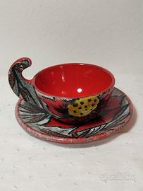 Vittoria Mazzotti Albisola - figlia di Giuseppe, fondatore nel 1903 - condusse l'azienda con il fratello Tullio sino al 1984 quando passò nelle mani della figlia Esa che cambiò la ragione sociale in "Ceramiche Mazzotti-Esa". In ottime condizioni: Dimensioni: tazza: altezza cm 8 compreso manico - bocca larghezza diametro cm 9,5 - base diametro cm 4,5; piattino diametro cm 14; lattiera: altezza compreso manico cm 11 - bocca diametro cm 6,5 - base diametro cm 5.