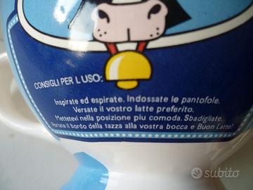 Vendo grande scodella con manico in ceramica," happy milk", misura cm. 15 x 10 e due mucca versalatte in ceramica, misurano cm. 14 x 10, oggetti vintage, in buone condizioni.