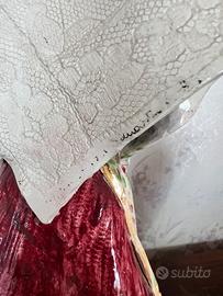 Sullo scialle lateralmente appare una scritta o una firma dell'artista, poco decifrabile perché consumata dal tempo. Il lavoro è molto raffinato, ricco di particolari, montato su più strati di ceramica e dipinto a mano con colori policromi, rispettando i dettagli del vestito originale a cui fa riferimento l'artista.