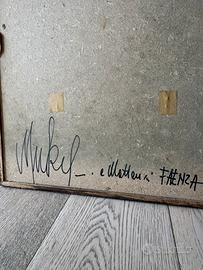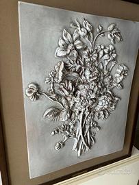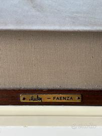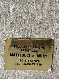 Ceramica artistica di Faenza (RA) dello studio "Matteucci e Muky". Si tratta di un pannello riproducente in rilievo un mazzo di fiori, su tonalità - elegante - grigio-carta da zucchero. L'opera è databile intorno ai primi anni '80. Muky e Matteucci hanno costituito un rilevante sodalizio artistico della scena culturale, non solo nell'ambito della ceramica, fino alla scomparsa di lui, nel 1991. Muky, nata a Trento nel 1926, dal 1955 (dopo gli studi artistici a Roma) si trasferisce a Faenza dove conosce il suo mentore (e poi marito) Domenico Matteucci, sviluppando in modo eclettico la naturale inclinazione artistica (è pittrice, scultrice, ceramista e poetessa), portando a Faenza - e non solo - un nuovo linguaggio artistico, legato all'informale e alla bicromia bianconero, stilema dell'epoca. Dalla fine degli anni '60 avvia nella Loggetta del Trentanove un cenacolo culturale per incontri artistici, letterari, intellettuali e musicali. È riuscita a far gravitare attorno a sé i grandi temi della pittura, della letteratura e della medicina, richiamando nel suo cenacolo personaggi come Enzo Biagi, Dario Fo, Ottavia Piccolo. Ed ha sostenuto e formato generazioni di giovani. Scompare il 7 gennaio del 2022. La formella (priva di difetti, graffi o scheggiature) misura 46 cm di altezza (62 cm compresa la cornice), 35 cm di larghezza (51 cm compresa la cornice) e 2,5 cm di profondità (oltre al rilievo). Prezzo non trattabile.