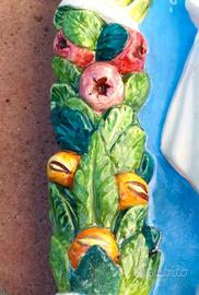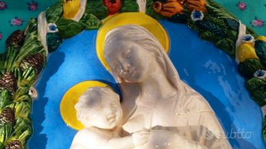 Ceramica robbiana di ottima fattura raffigurante Madonna con bambino con cornice di fiori e frutti applicati a mano. Placca in bassorilievo realizzata artigianalmente in Italia, riproduzione delle ceramiche dello scultore toscano rinascimentale Luca Della Robbia. Realizzazione con la tecnica della maiolica smaltata invetriata che garantisce resistenza nel tempo ed agli agenti atmosferici e mantiene la vivacità dei colori (come si vede dalle foto), rendendo la ceramica adatta alla decorazione di pareti e facciate, anche in ambienti esterni; misure 58 x 35, vendo a € 790
