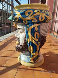 Vendo ceramica a forma di Vaso Testa di Moro . Dimensioni : altezza 37, diametro alla base 20 cm e diametro maggiore 22 cm . Testa di Moro, rappresenta un uomo Africano con turbante sulla testa e il viso barbuto ; effetto Crackle - finitura decorativa che crea un reticolo di sottili fessurazioni sulla superficie smaltata, conferendo un aspetto invecchiato/vintage . Non ci sono ne rotture e ne mancanze. Ottimi colori .