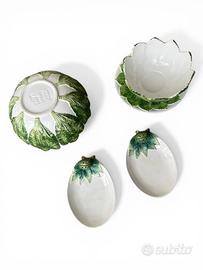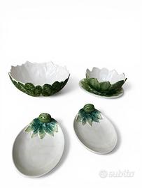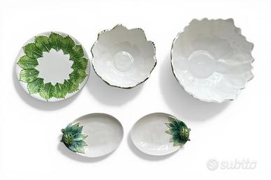 Servizio da antipasto in ceramica smaltata di produzione italiana, realizzato a Bassano, noto centro ceramico. Ceramiche Bassano – Servizio da antipasto “a foglia” (5 pezzi) – Italia, XX secolo Il set presenta decorazione naturalistica a foglie verdi in rilievo, con finitura lucida. Composizione del lotto: * 1 insalatiera grande * 1 ciotola media * 1 piatto da portata / sottopiatto * 2 piatti ovali con presa decorativa ⸻ Caratteristiche: * Produzione: Bassano, Italia * Materiale: ceramica smaltata * Decorazione: motivo vegetale in rilievo * Epoca: seconda metà del XX secolo * Marchio “Bassano Italy” presente su più elementi