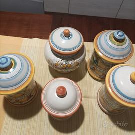 contenitori "vecchia farmacia" caffè, camomilla, pepe, sale, molto belli e decorativi. coperchio contenitore pepe sbeccato non visibile.