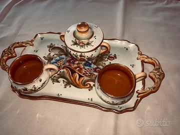Collezione composta da sei pezzi unici cominciando da un pregiato servizio da caffè composto da due tazzine, zuccheriera e vassoio tutti elegantemente decorati con motivi floreali coloratissimi e pregiate finiture in oro.( dimensioni vassoio 33x17 cm).