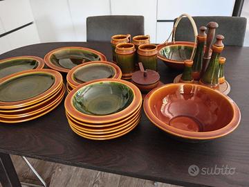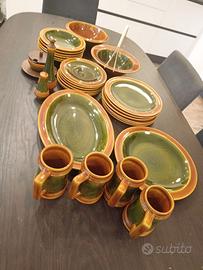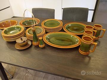 Nei colori verde, marrone e senape - Servizio per 6 coperti: 6 piatti fondi - 6 piani - 6 piccoli - piatto da portata grande ovale - piatto da portata tondo - formaggiera con piatto e coperchio - 1 insalatiera - 1 portafrutta con manico - 4 bicchieri grandi