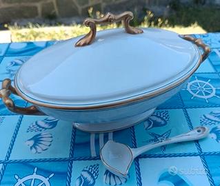 2 fini, eleganti ed intatte alzatine in porcellana Limoges con bordini dorati, e una bella ed elegante zuppiera Limoges, con il suo cucchiaio. Intatta, in ordine.