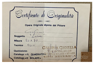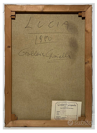 L’opera “Lucia” è un ritratto ad olio realizzato su tela nel 1950 a firma di Cerlini. Il soggetto è una bambina, colta in un momento di dolcezza e serenità, con lo sguardo rivolto verso l’osservatore e un accenno di sorriso che ne esalta l’espressività vivace. Il titolo, scritto sul retro della tela insieme alla data e alla firma, ci suggerisce una dimensione intima, forse familiare, che aggiunge valore affettivo oltre che pittorico all’opera. Dal punto di vista stilistico, il dipinto mostra una pittura figurativa realista, che si distingue per l’attenzione al dettaglio e la resa naturale della carnagione, dei capelli e dell’abbigliamento. La pennellata è morbida e accurata, con lievi sfumature che danno profondità ai volumi e alla luminosità del volto. I dettagli sono nitidi ma non fotografici: ciò che emerge è soprattutto il carattere della bambina, la sua presenza viva e delicata. Il fondo neutro, con velature di toni grigi e caldi, contribuisce a far risaltare la figura, isolandola in uno spazio indefinito e atemporale, che concentra lo sguardo sull’espressione e sul sentimento. La bambina è vestita con un abito azzurro chiaro decorato da un piccolo uccellino rosso ricamato: un dettaglio apparentemente semplice ma carico di valore simbolico. L’uccellino, elemento insolito in un ritratto infantile, potrebbe suggerire una dimensione di leggerezza, libertà o protezione, aggiungendo al dipinto una sfumatura poetica e affettuosa. Questo particolare, realizzato con una pennellata più sciolta rispetto al resto dell’opera, richiama l’attenzione per la sua valenza narrativa e la sua efficacia visiva nel rompere la compostezza dell’immagine con un tocco quasi illustrativo. Cerlini rivela una padronanza tecnica solida, attenta sia alla resa materica che al tono emotivo dell’opera. Sul retro compaiono il titolo, la data e un riferimento alla “Galleria Gioiella” di Bellaria, che testimonia la qualità pittorica dell’artista e la sua presenza nel circuito artistico.