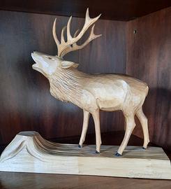 Cervo al bramito intagliato nel legno (artigianato Erzgebirge, Germania). Dimensioni: altezza totale 26 cm, base 28,5×7×3 cm.