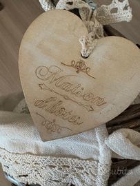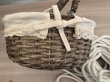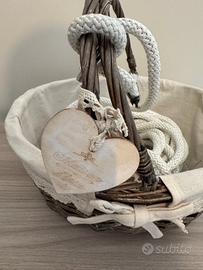 Cesta in vimini della Maisons d’hôtes di colore grigio con tovaglia interna, decorata con un cuore in legno, dotata di una corda lunga 15 m, nuova mai utilizzata, pratica sia per Pic-nic o per cibo sulla tavola come ornamento.