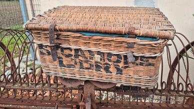 vintage , cesta in vimini e cuoio, anni 70 con fodera e cinghie di chiusura.